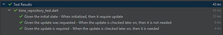 I created some sample code to test the passing time. We have a simple repo, which needs to be updated every five minutes. If no update attempt has occurred, we want to update the repo. This dumbed-down simplified version only considers time, whereas the code uses the clock.now() instead of DateTime.now().