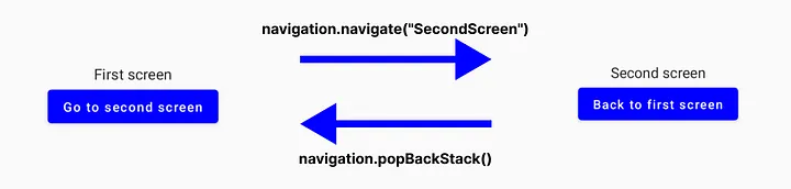 Stack can be viewed as a history of the composables/screens, so first screen is the root and other composable is put on top of it. So by navigating to second screen, the second screen is added on top of the stack. By popping out the stack, the top composable is removed.
