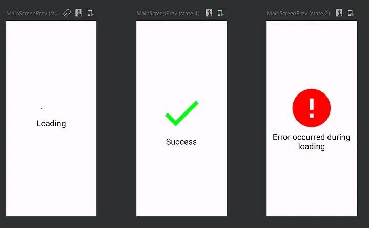 The Values field is overridden and gives us the place to put our custom data. For every entry, the provider will create a new Preview. The input parameter is annotated with our provider @PreviewParameter(MainStateProvider::class) and the compiler will take care of the rest.