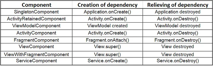 You can imagine it as layers activated in the queue and how the app becomes alive. If the app is started, all the singletons in SingletonComponent are initialized. If the activity is created, all the components installed in the ActivityComponent are initialized. Components activated sooner are available to other components but not vice versa. If the dependency is initialized, it is initialized with new instances of needed dependencies. The order in which the dependencies are initialized is in the table below.
